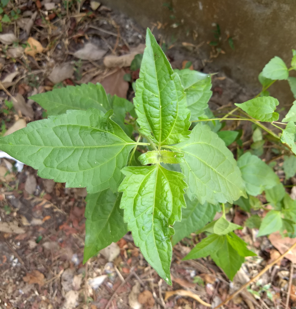 Cây nhỏ, cao 1 – 2m, mọc thành bụi, phân nhiều cành nằm ngang. Thân tròn, màu rất nhạt, có rãnh và lông nhỏ mịn. Lá mọc đối, hình gần tam giác, dài 6 – 9cm, rộng 2 – 4cm, gốc thuôn vát, đầu nhọn, mép có răng cưa to, vò ra có mùi hăng hắc, hai mặt lá cùng màu có lông mịn, dày hơn ở mặt dưới, gân chính 3; cuống lá dài 1 – 2cm.