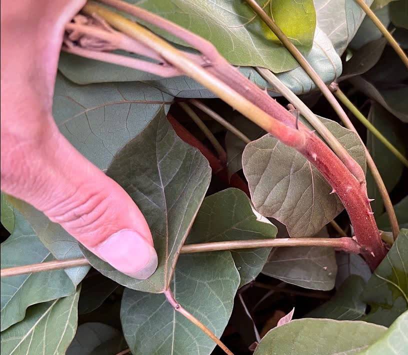 Mô tả hình thái (Đặc điểm nhận dạng): Cây nhỏ cao khoảng 3m; lá có phiến xoan tim, đầu tù có mũi cao, đặc trưng với cuống lá màu đỏ tía khi già, và có hai tuyến tròn màu nâu ở gốc lá.